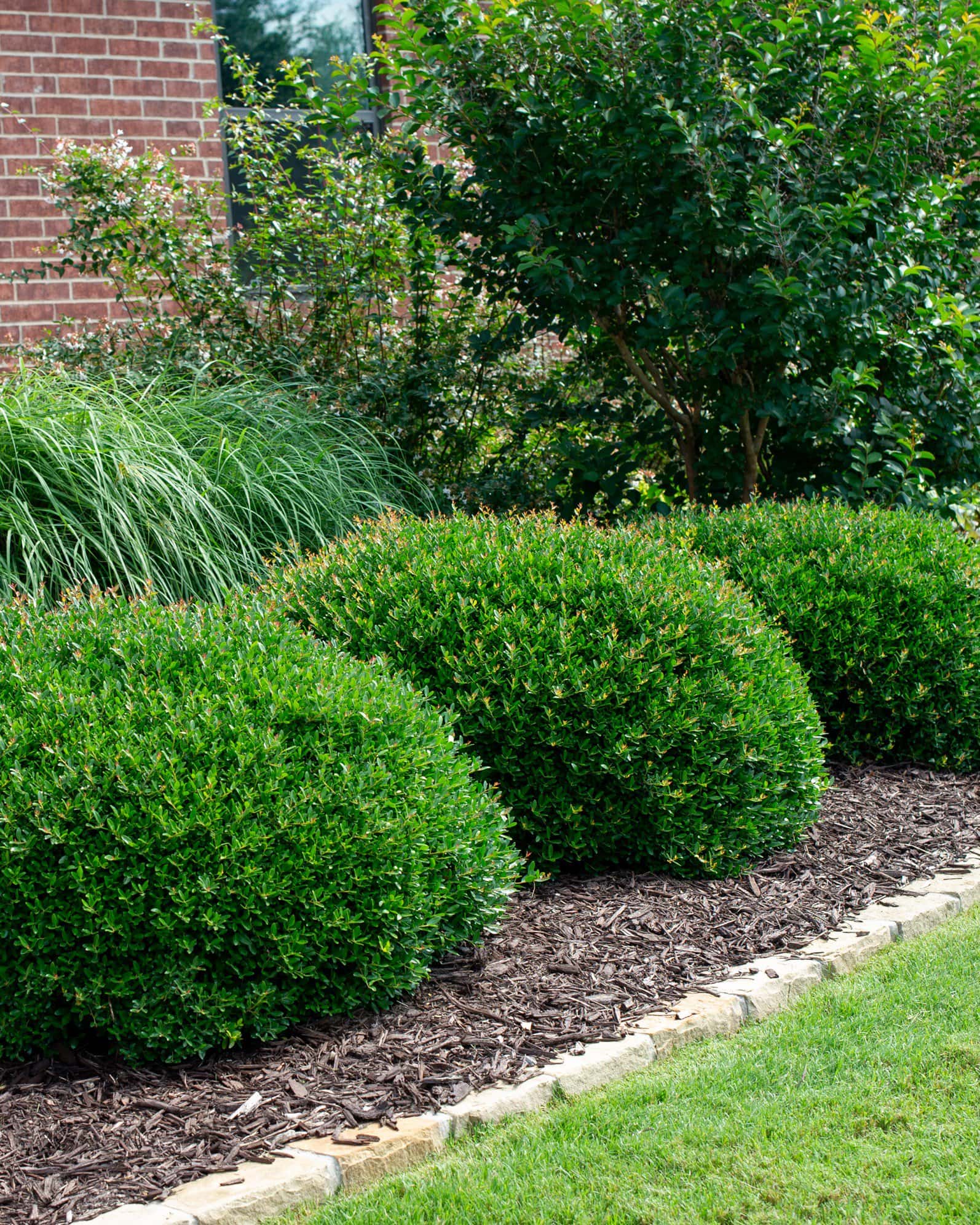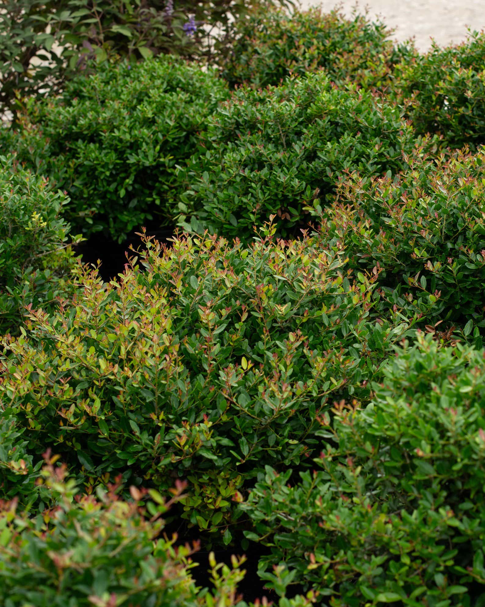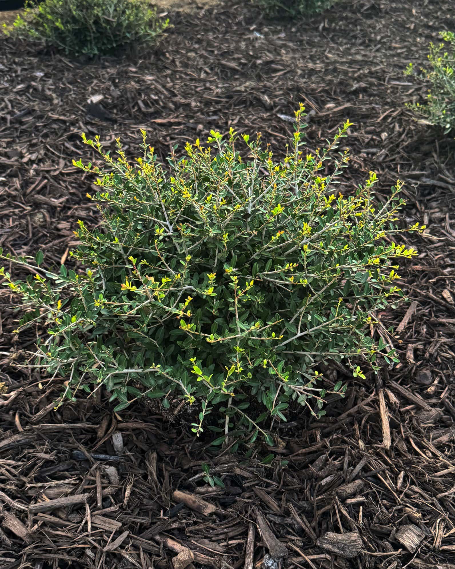Ilex vomitoria ‘Nana’Dwarf Yaupon Holly is a tough, reliable evergreen shrub known for its fine-textured green foliage and compact, mounding shape. Reaching 3 feet in height and width at maturity, it forms a tidy silhouette that fits well in both formal and naturalistic landscapes. Its small leaves and dense branching make it perfect for sheared hedges or borders.