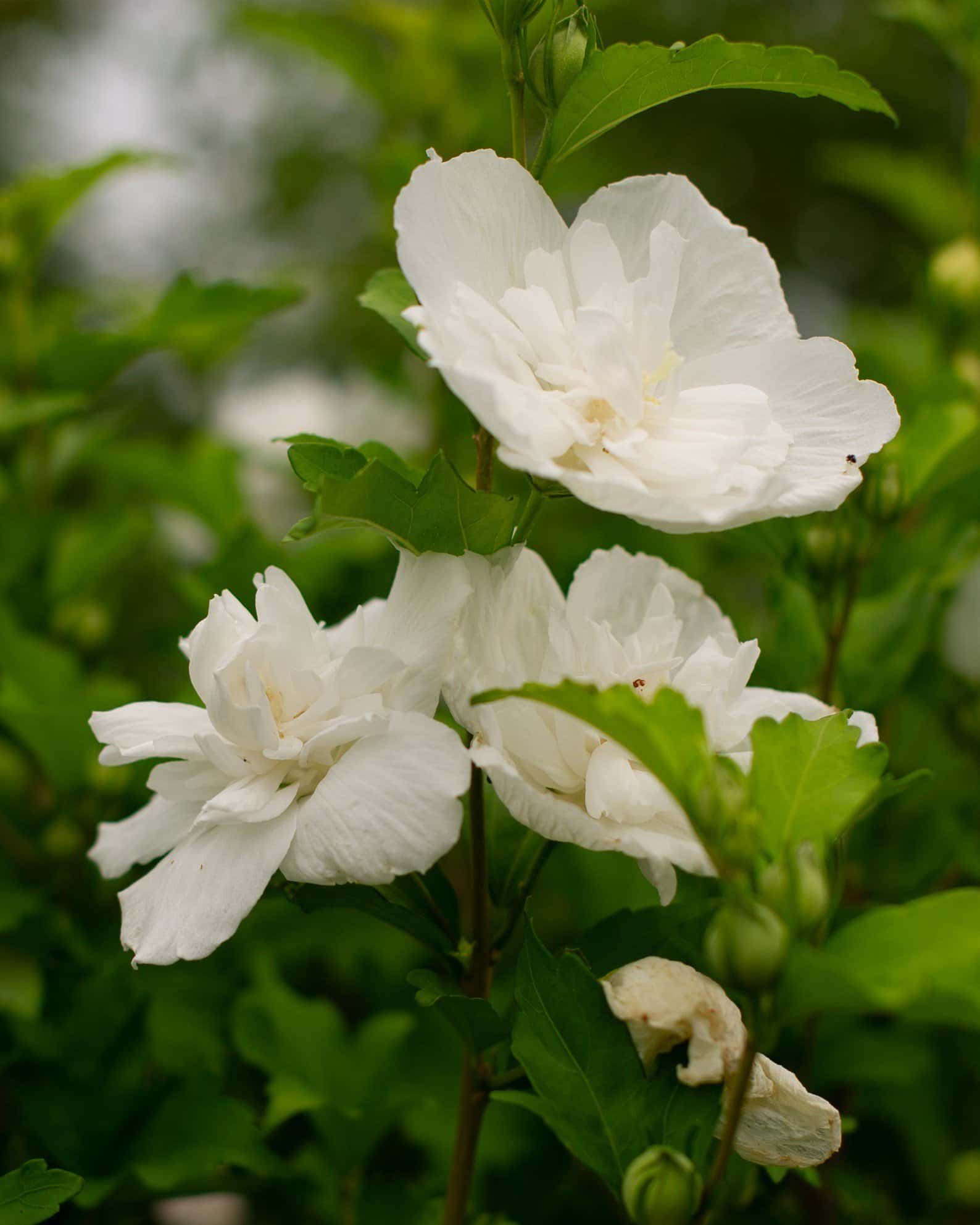 Hibiscus syriacus 'Notwoodtwo'White Chiffon Althea Tree Form is the picture of elegance. This refined Rose of Sharon variety features soft, fully double white flowers that bloom continuously from spring through summer. The blooms have a delicate, layered look - like handmade fabric petals fluttering in the breeze. It grows 8 feet in height and 5 feet in width. White Chiffon adds vertical interest and a polished feel to beds, borders, and containers.
